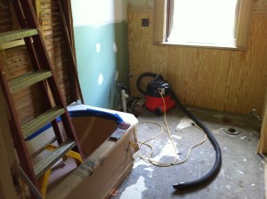 I think left to my own devices I would probably let the yard and the house fall into disrepair. Geoff says I have a Grey Gardens approach to home ownership. If a 40-year-old brittle blind tears, I roll it up so you can’t tell. And when a toilet breaks, I think — let’s just close off that bathroom — we’ve got others. But Geoff would rather not live with leaking toilets, a yard full of weeds and dying trees, peeling lead paint on the windows, and a 50-year-old heating system. I guess I can’t really blame him. So we’ve begun the renovation of one bathroom, and have found the time, the cost and the hassle all a bit more than we’d like.