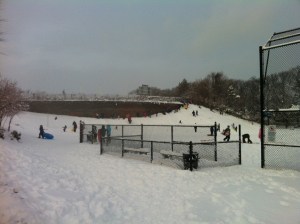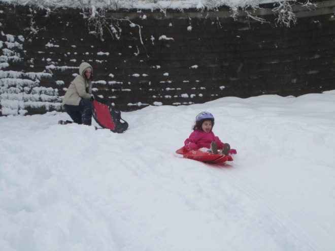 Although I grew up in New York City, our building in Riverdale happened to be perched atop a hill making sledding at least feasible, if a bit dangerous (your ride ended with a tree or in the road). But it’s hard to imagine a more perfect sledding spot than the one at Moses Brown School. With over a foot of snow in the Providence area today, we joined dozens of kids and adults with an array of brightly colored sleds and tubes who arrived there for sled rides down a variety of hills – some short, subtle ones for beginners and two steep ones for the more adventurous. All of them end in a nice flat field of snow making it fairly safe, except for the occasional collision (like the one when Madeline crashed into me as I stood in her riding path to take an action shot). For our first time out, we stuck to the novice hills and gave the two sleds we bought yesterday at Benny’s a couple of good runs. I’m just glad that I bought two sleds, so when Madeline wanted to go by herself, there was still another sled for me.