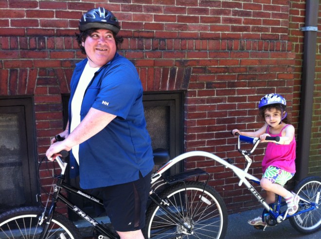 As you may have guessed from the ratio of blog posts on restaurants versus sports and recreation, we are not the most athletic of families. But inspired by a recent “bike to school” day, we decided to purchase a trailer bike, which enables our 5-year-old to feel like she’s riding a regular bike (and can even help peddle) but leaves the steering and the braking to the adult rider.