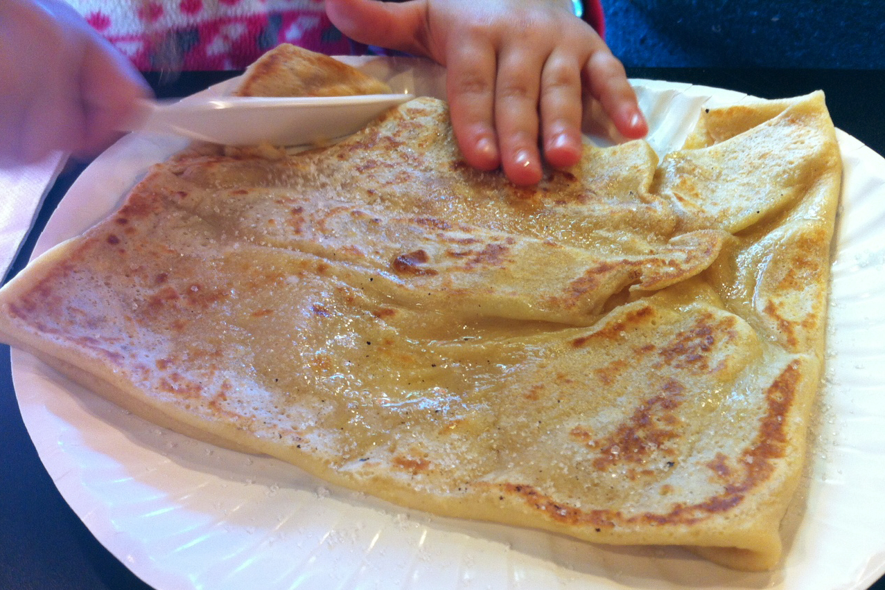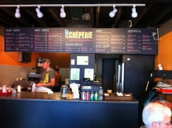 But this morning the request came, and we couldn’t fill it, so we went to La Crêperie, which serves up traditional French crêpes–wheat or buckwheat–composed with your choice of savory or sweet fillings. They also have Belgian waffles, wraps, salads, and smoothies–none of which we’ve tried yet. Like I said, we’re a crêpe family, and judging by the stream of customers this morning, we’re not the only ones.