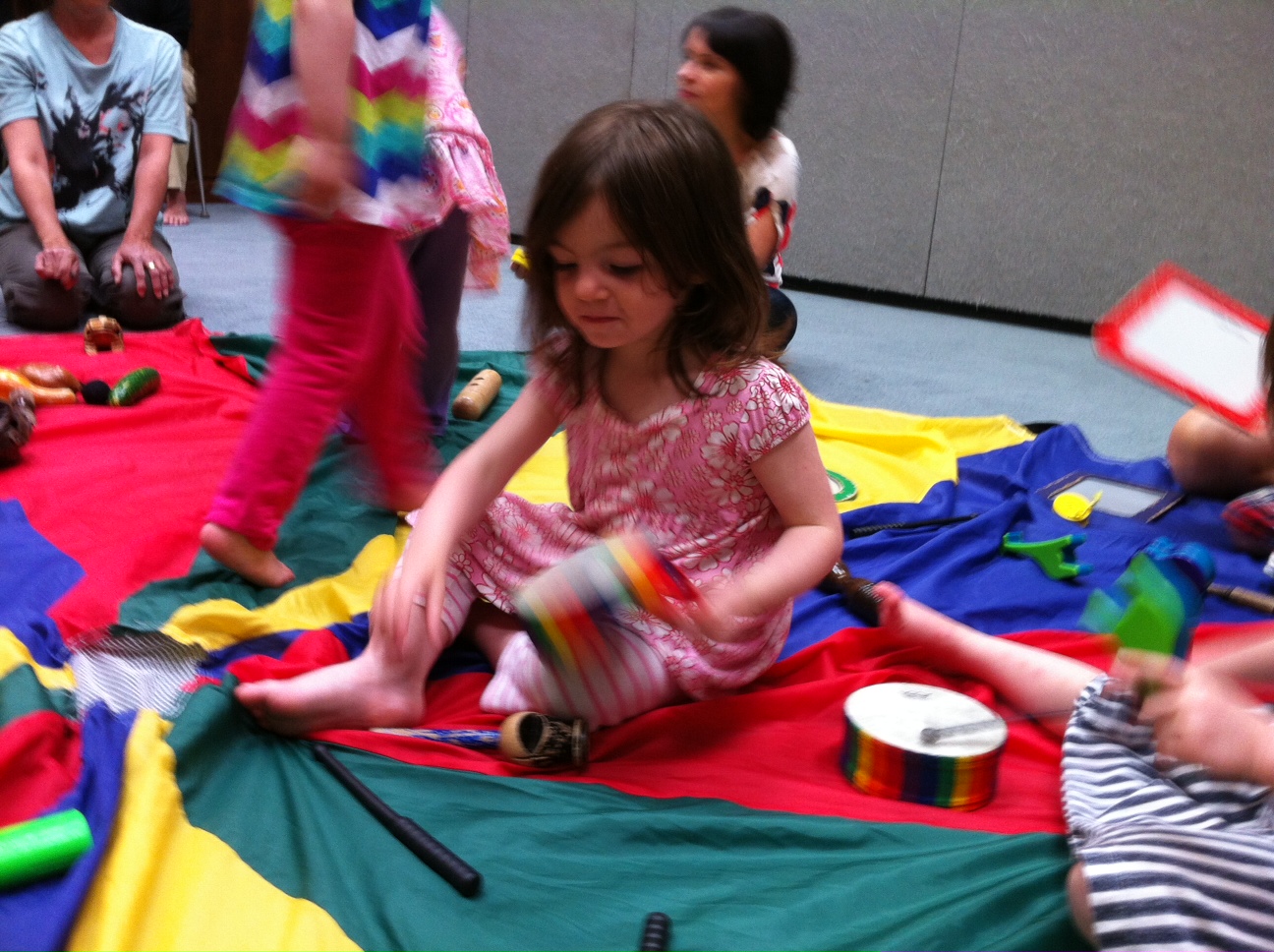Local mom and musician Jen Romanat runs our East Side Music Together class — in our most recent class, Jen led songs on both her guitar and ukulele, and the children sang, dance, spun with the parachute, and tried out a variety of instruments including drums, maracas, and tamborines.